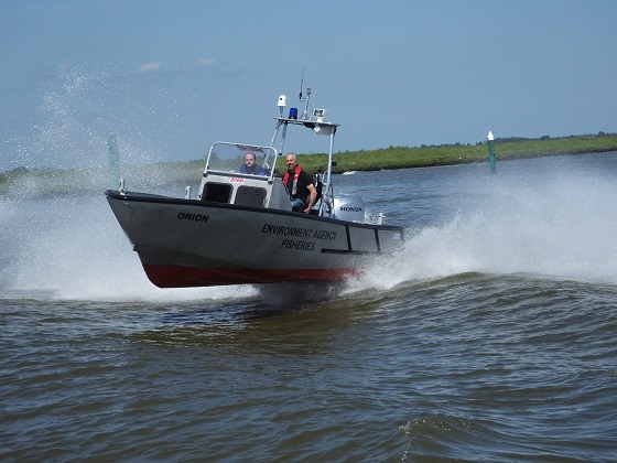 A Goodchild Marine boat with two people riding on it in the water. Keywords: Goodchild Marine